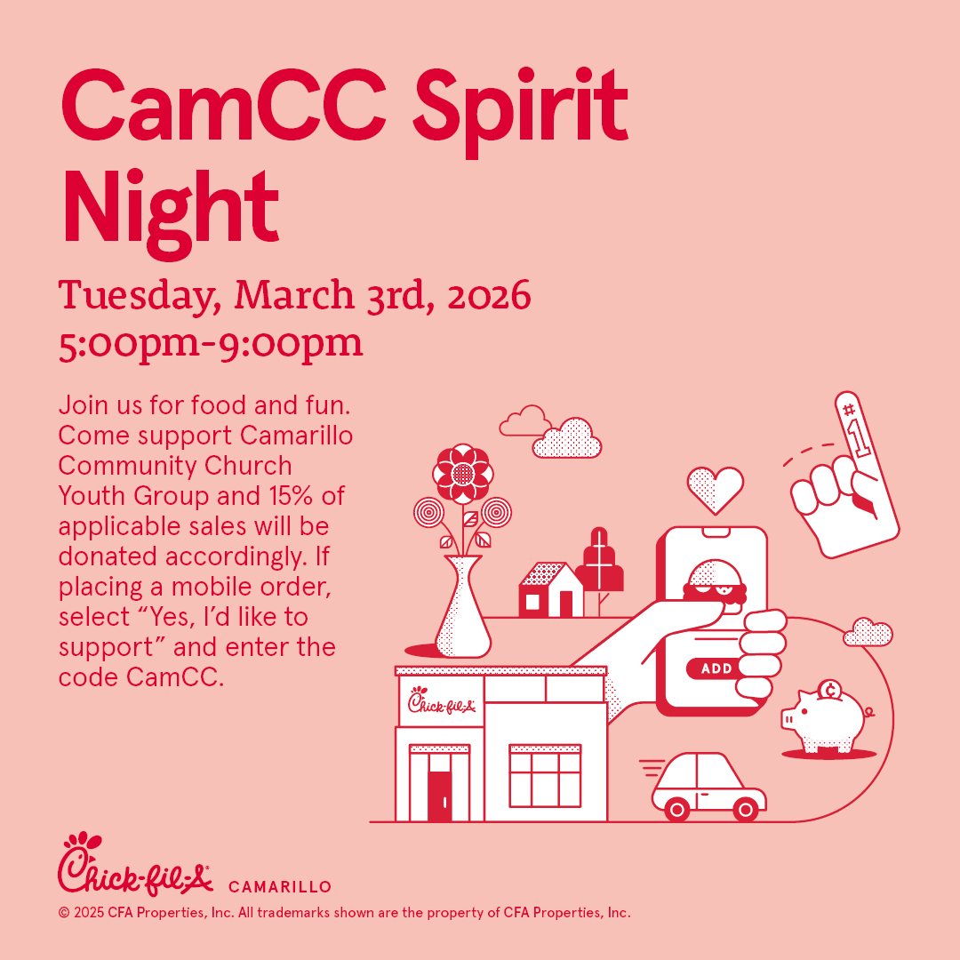 • Tues, Mar 3 from 5-9pm at Chick-fil-A in Camarillo. Download the flyer below (or select "Yes, I'd like to support" and enter code CamCC for online orders. They will generously donate 15% of sales!