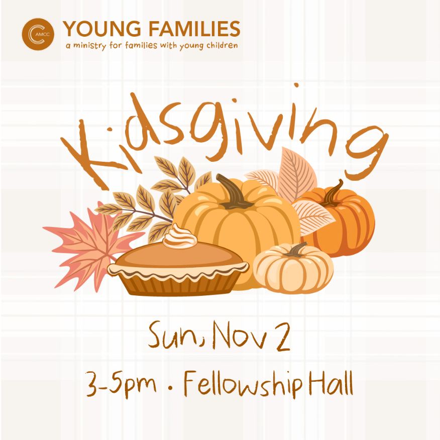 • Nov 2, from 3-5pm in the Fellowship Hall: Kidsgiving! Bring your child's favorite snack to share and enjoy fall themed crafts and activities! We also encourage families to consider bringing canned food items to donate to the CamCC food pantry.